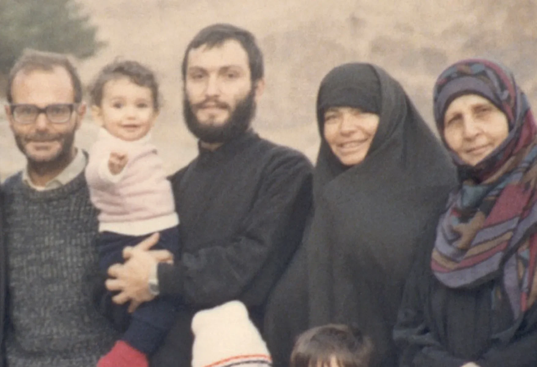 عماد مغنيّة (في الوسط) بعمر الـ25 عامًا حاملًا نجله مصطفى، برفقة والدة زوجته سعدى الحاجة “أم مصطفى بدر الدين” (الأولى على اليمين)، ووالديه الحاج فايز مغنية والحاجة آمنة سلامة، ومعهم الطّفلتان زينب شقيقته، وكريمتُه فاطمة، في رحلة سياحية عائلية، في منطقة كرج أطراف إيران، في شهر حزيران عام 1987.