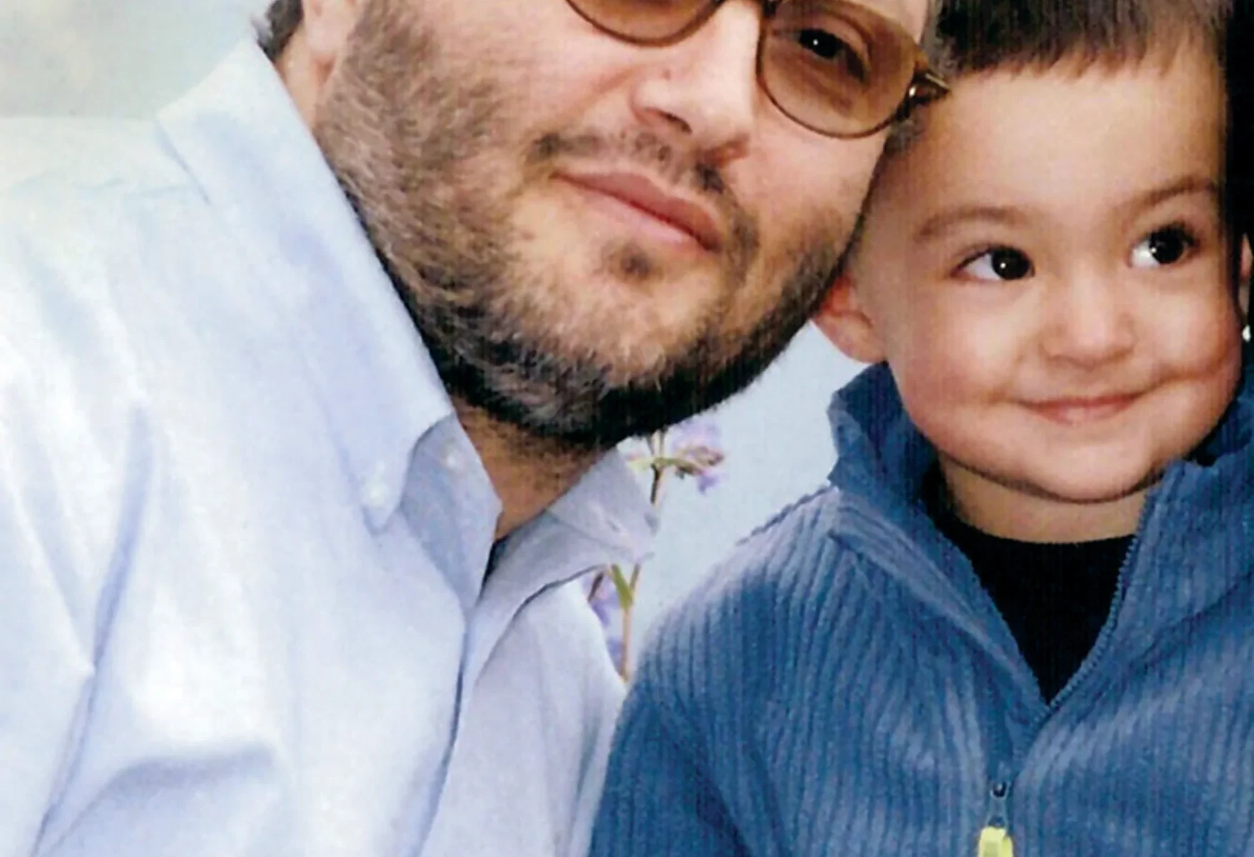عماد مغٍنيّة بعمر الـ41 عامًا، برفقة حفيده حسين عبدالله، المناسبة (غير محدّد)، المكان (غير محدّد)، في العام 2003.